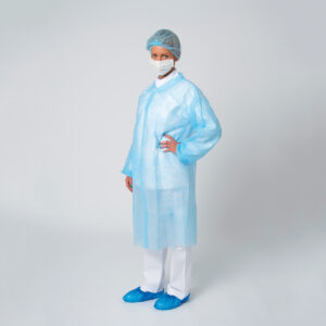 Σετ επίσκεψης σε μπλε απόχρωση. Περιλαμβάνει ποδιά, CPE κάλυμμα υποδημάτων και σκούφο προστασίας (δεν περιλαμβάνει μάσκα).